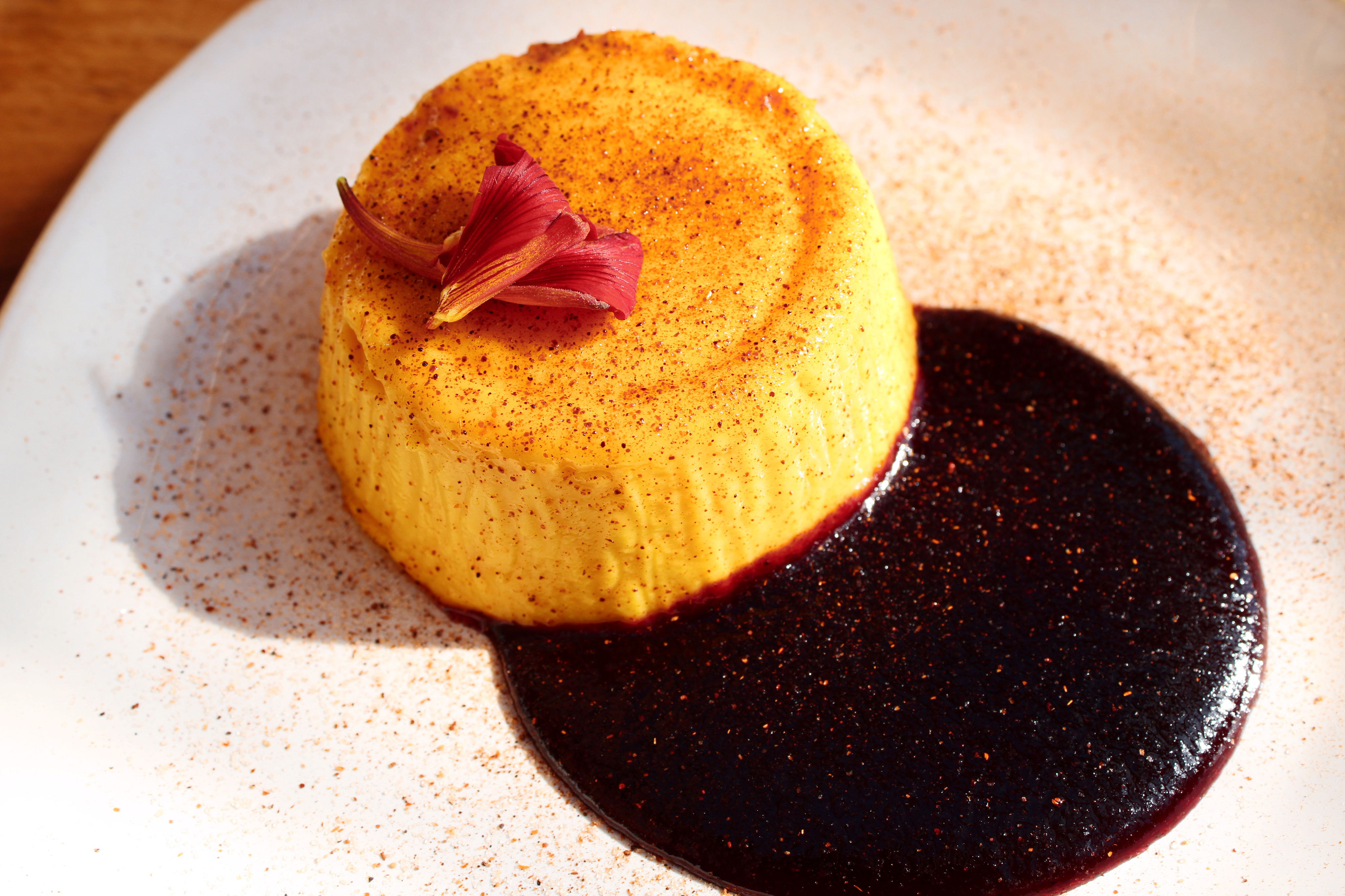 Mango Pannacotta served on local blueberry coulis, with a dusting of chili sugar