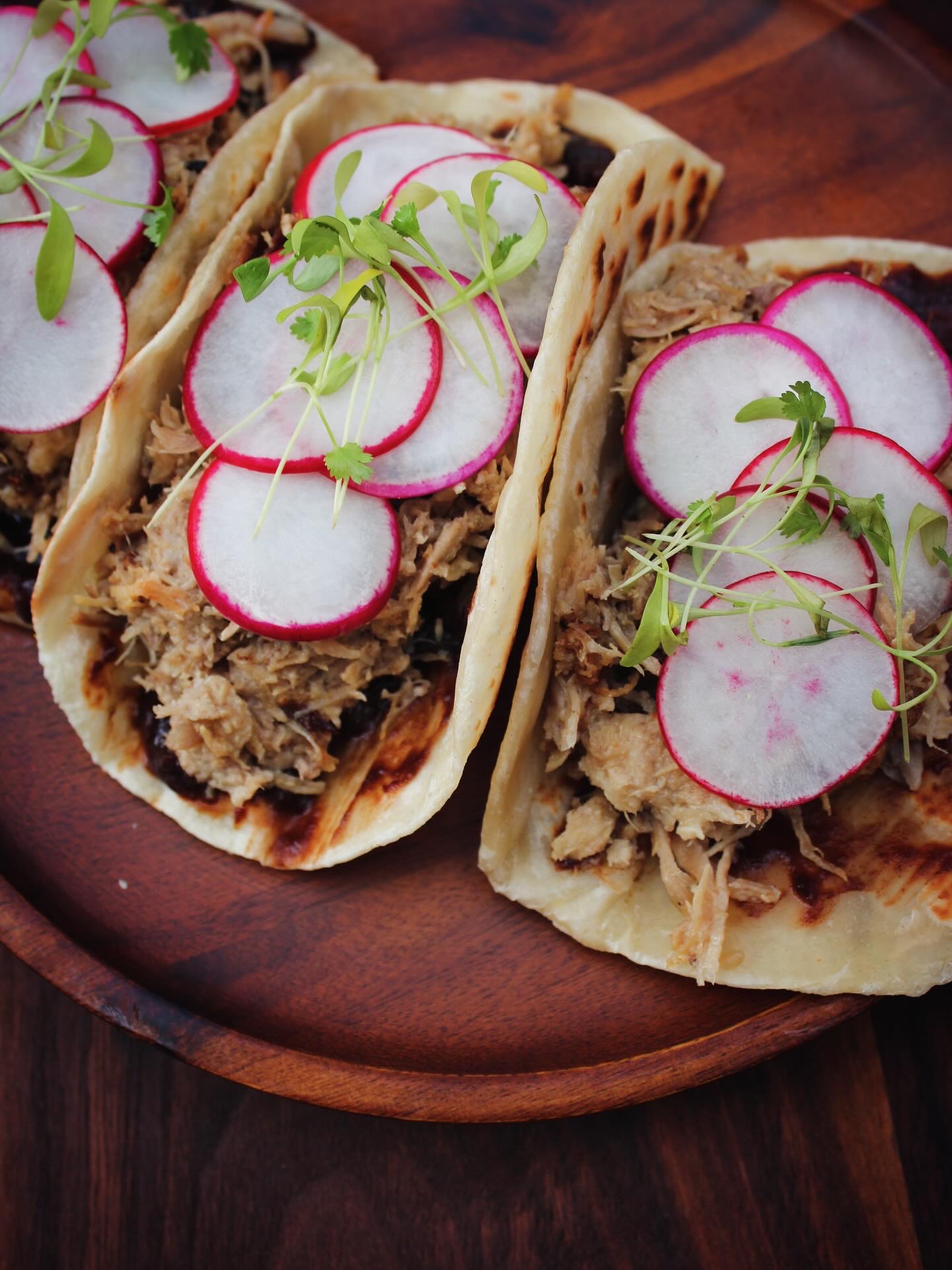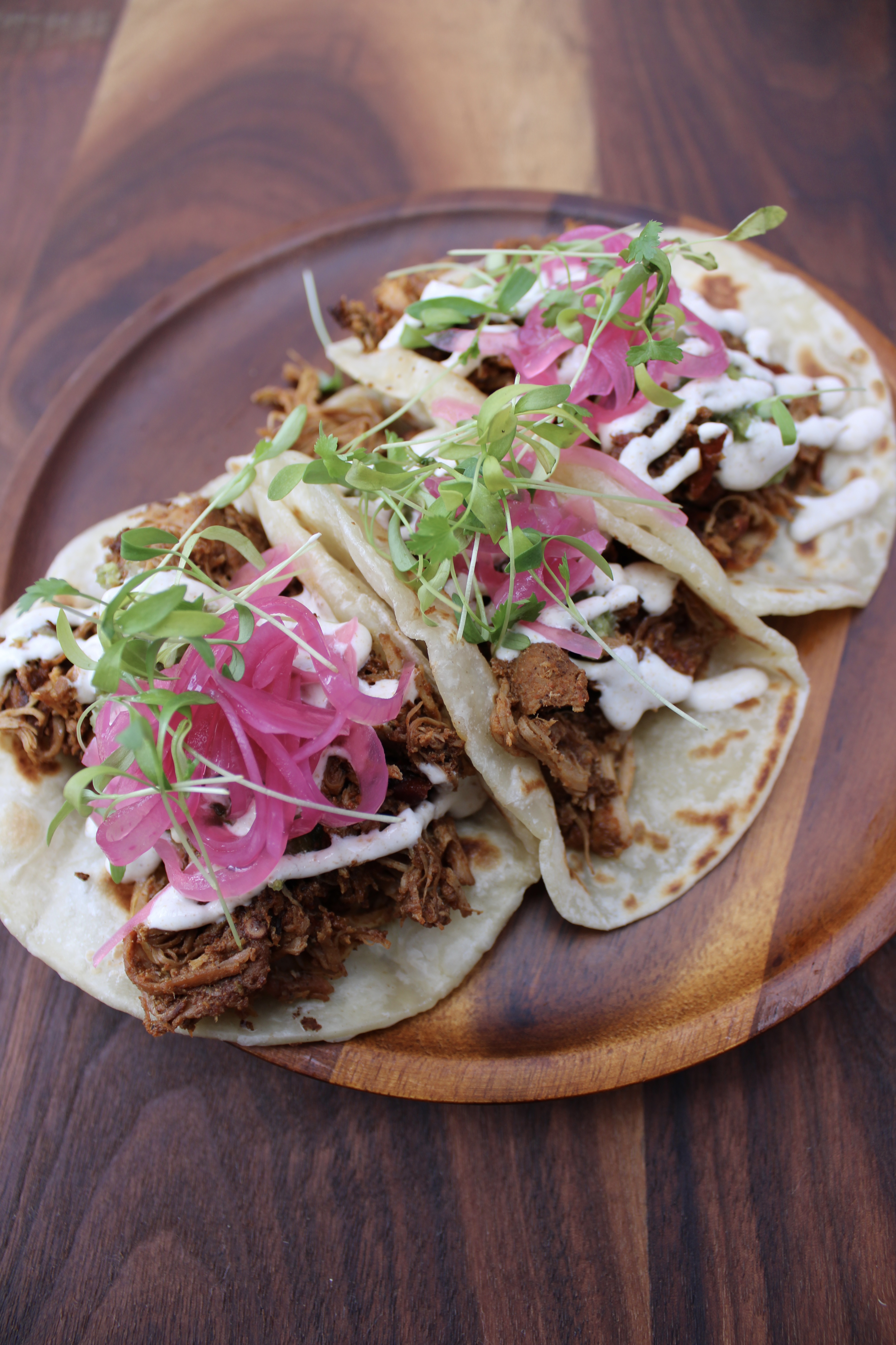 Chicken tinga topped with pickled red onion, salsa verde, coriander-lime crema, microgreens