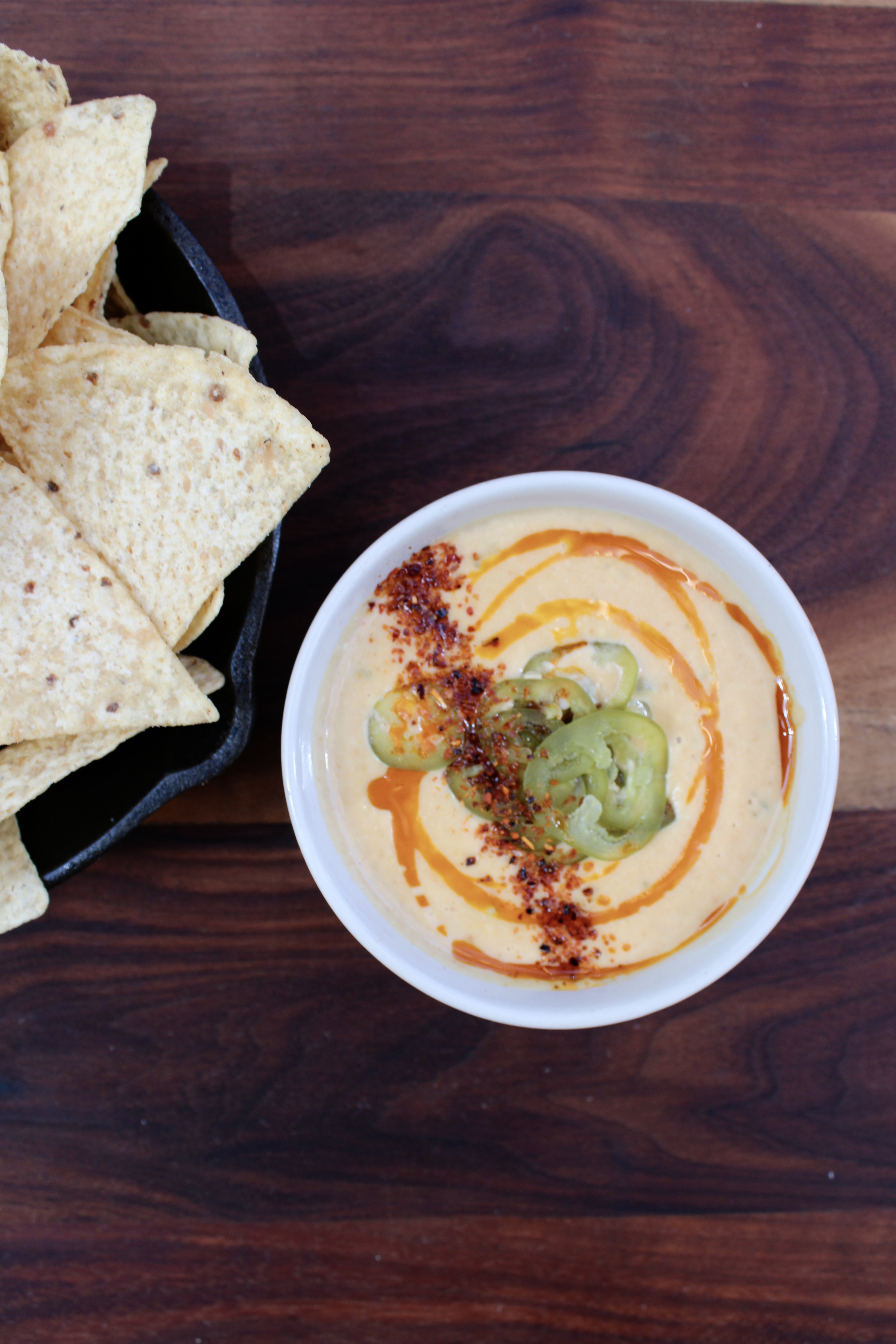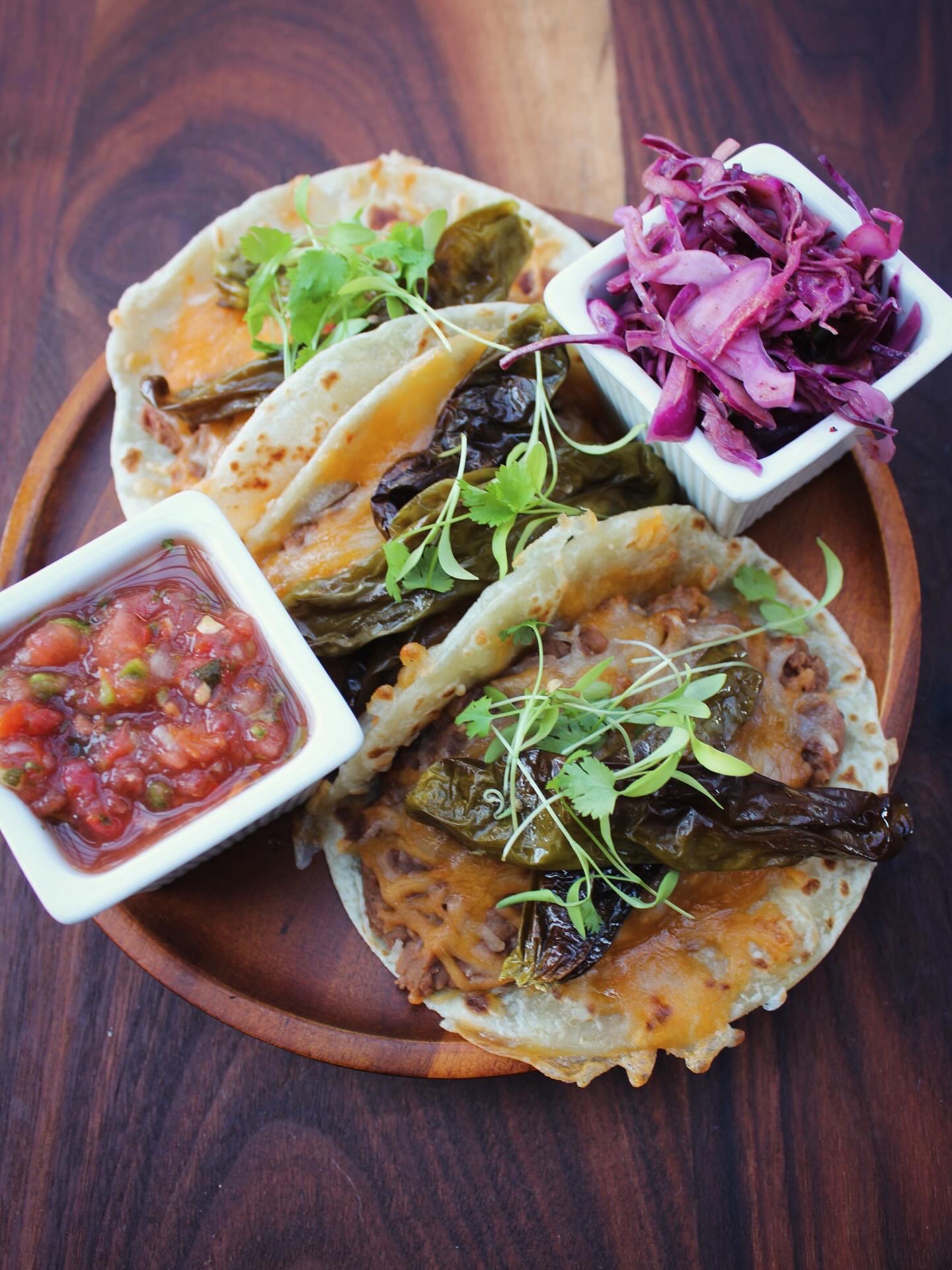 Refried beans, cheese, roasted shishito peppers, with a side of salsa.
