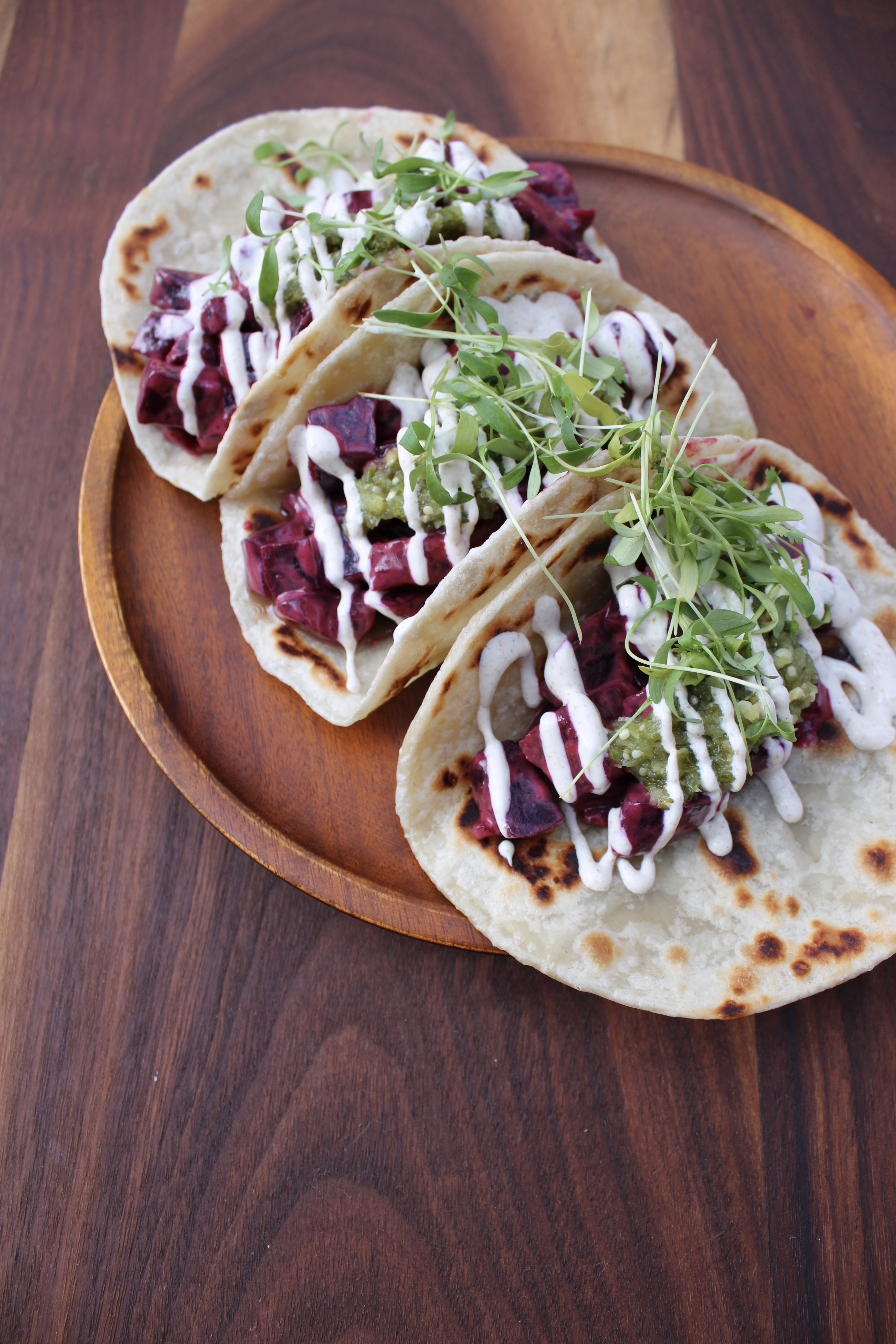 Beets marinated in chipotle aioli, salsa verde, coriander-lime crema, microgreens