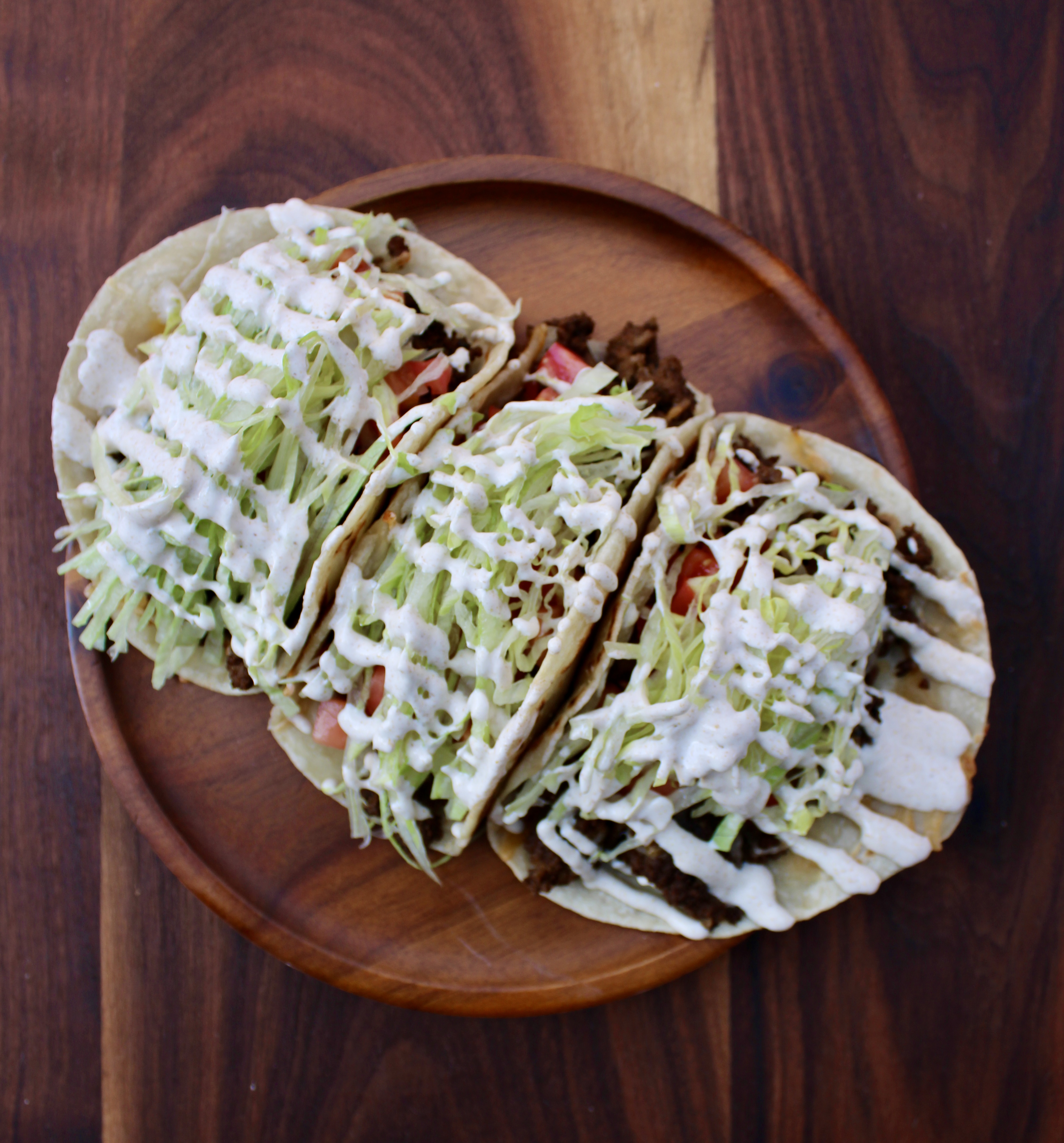 Seasoned ground beef, cheese, tomatoes, lettuce, coriander-lime crema