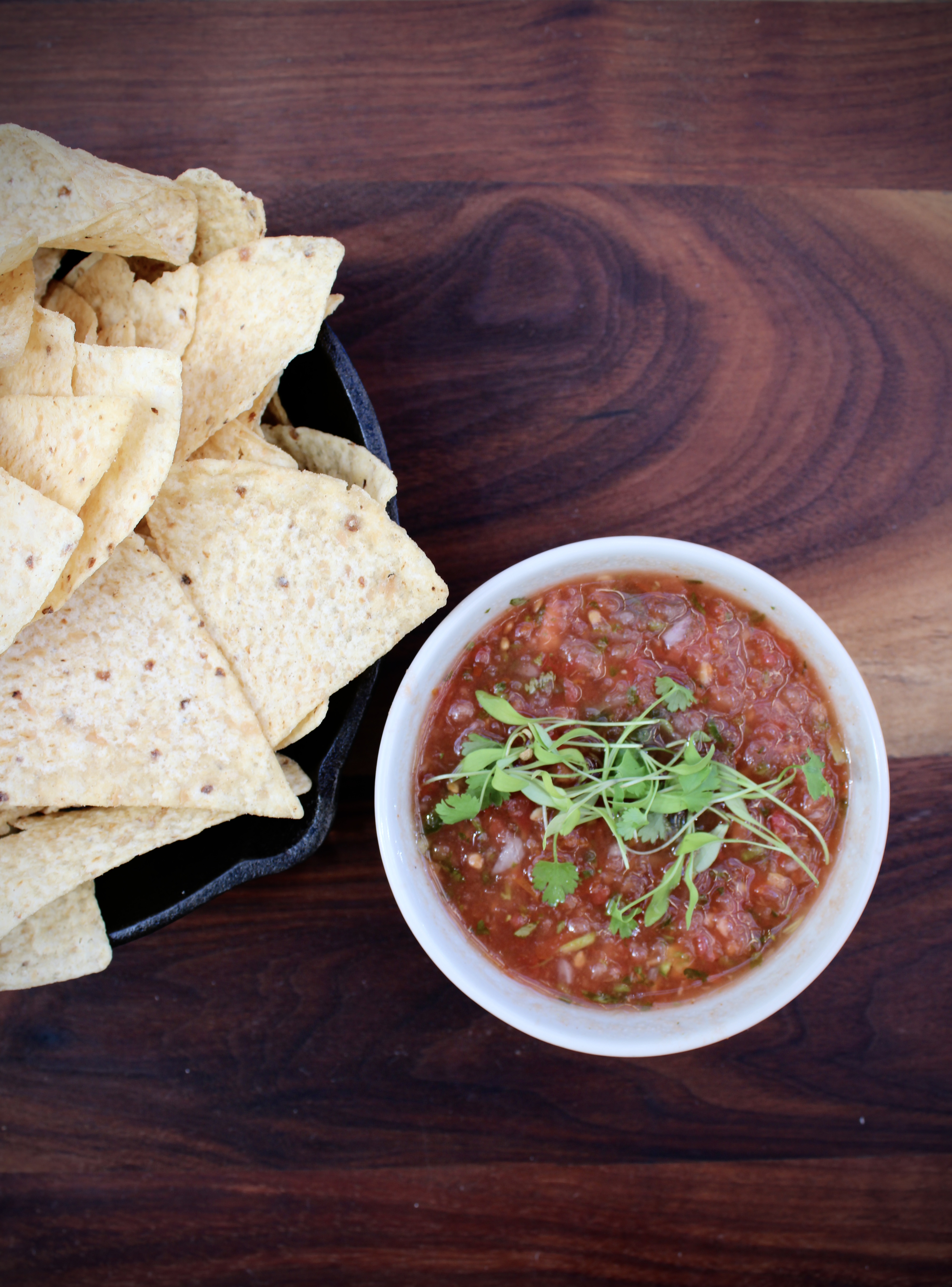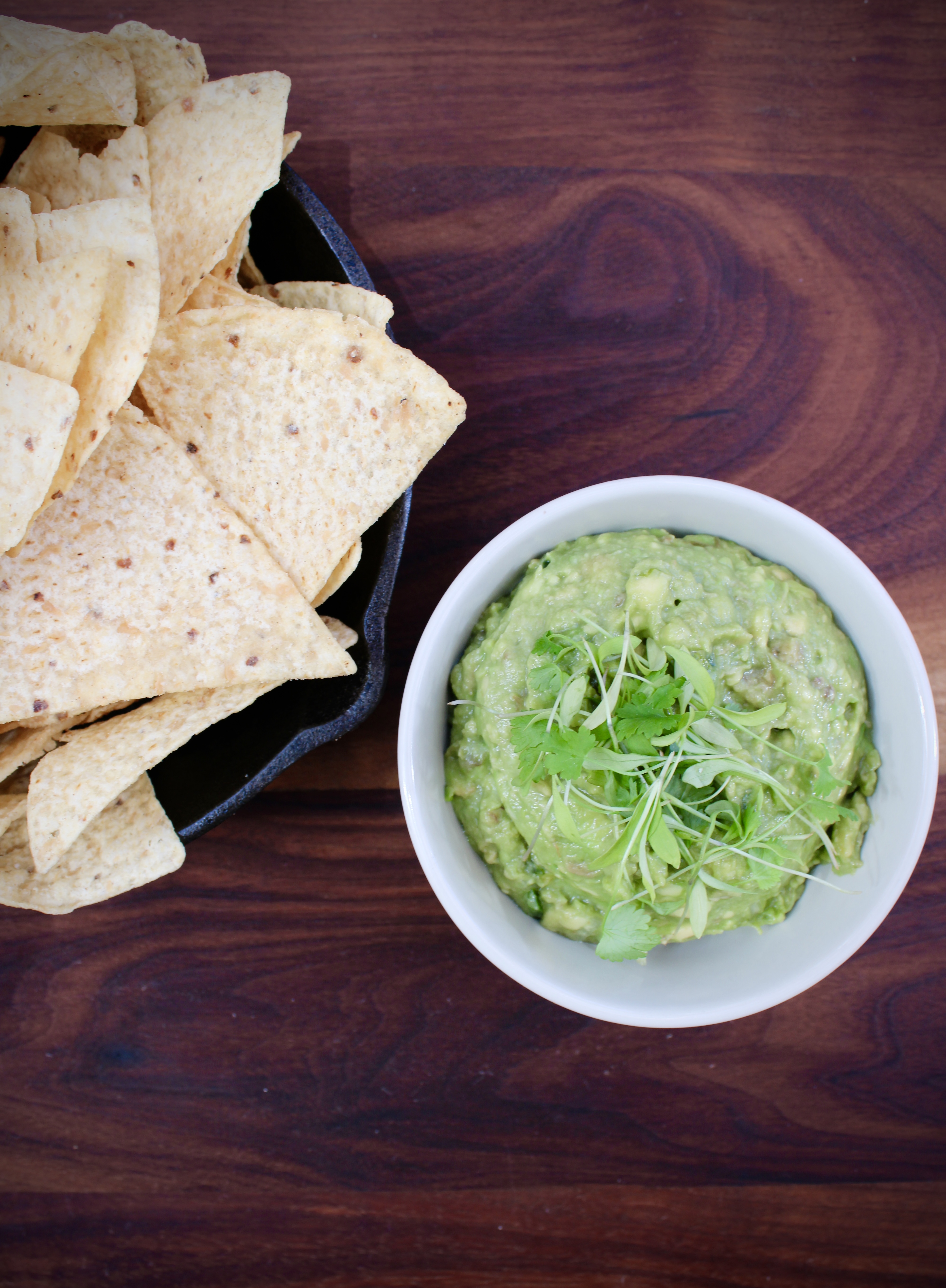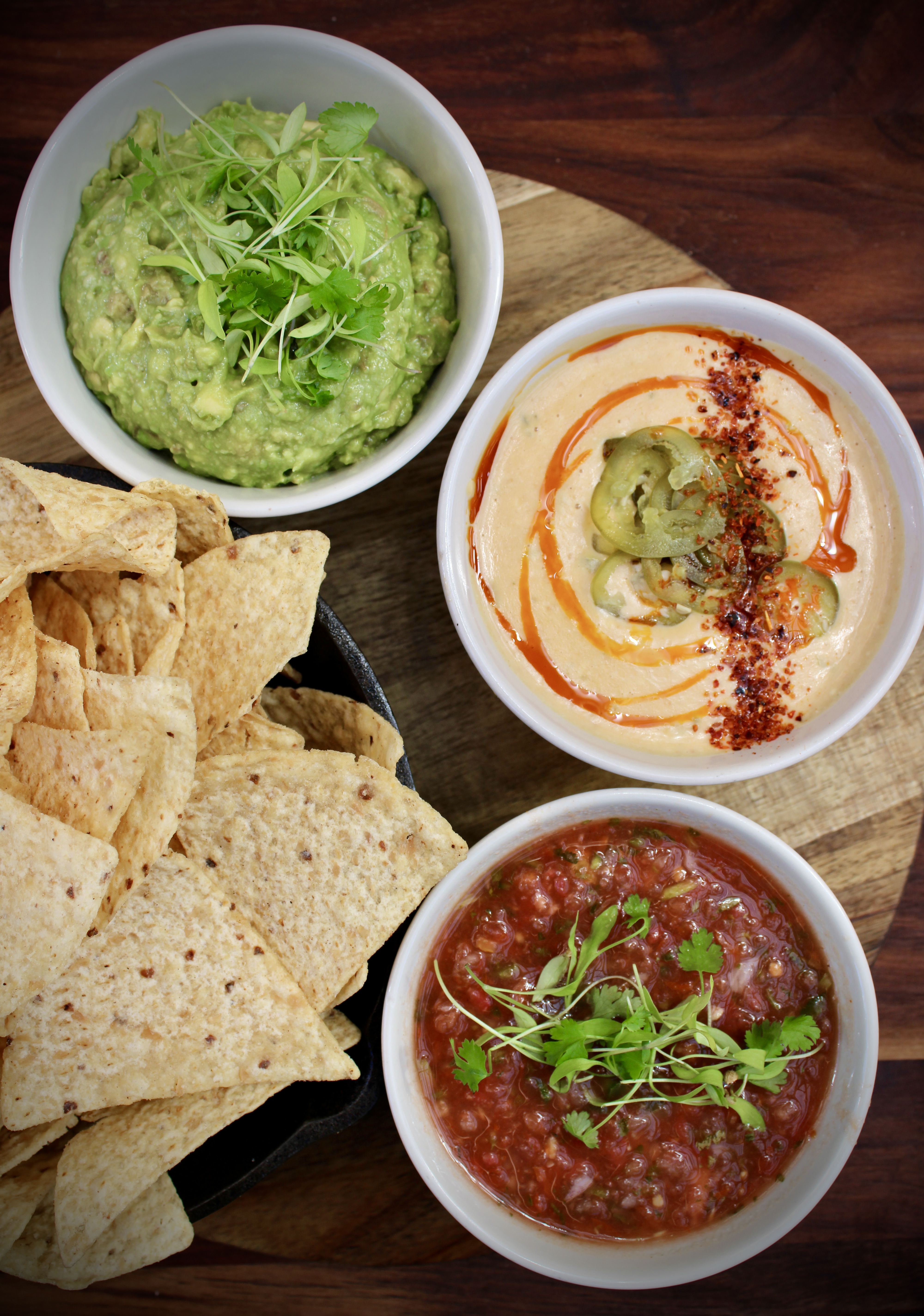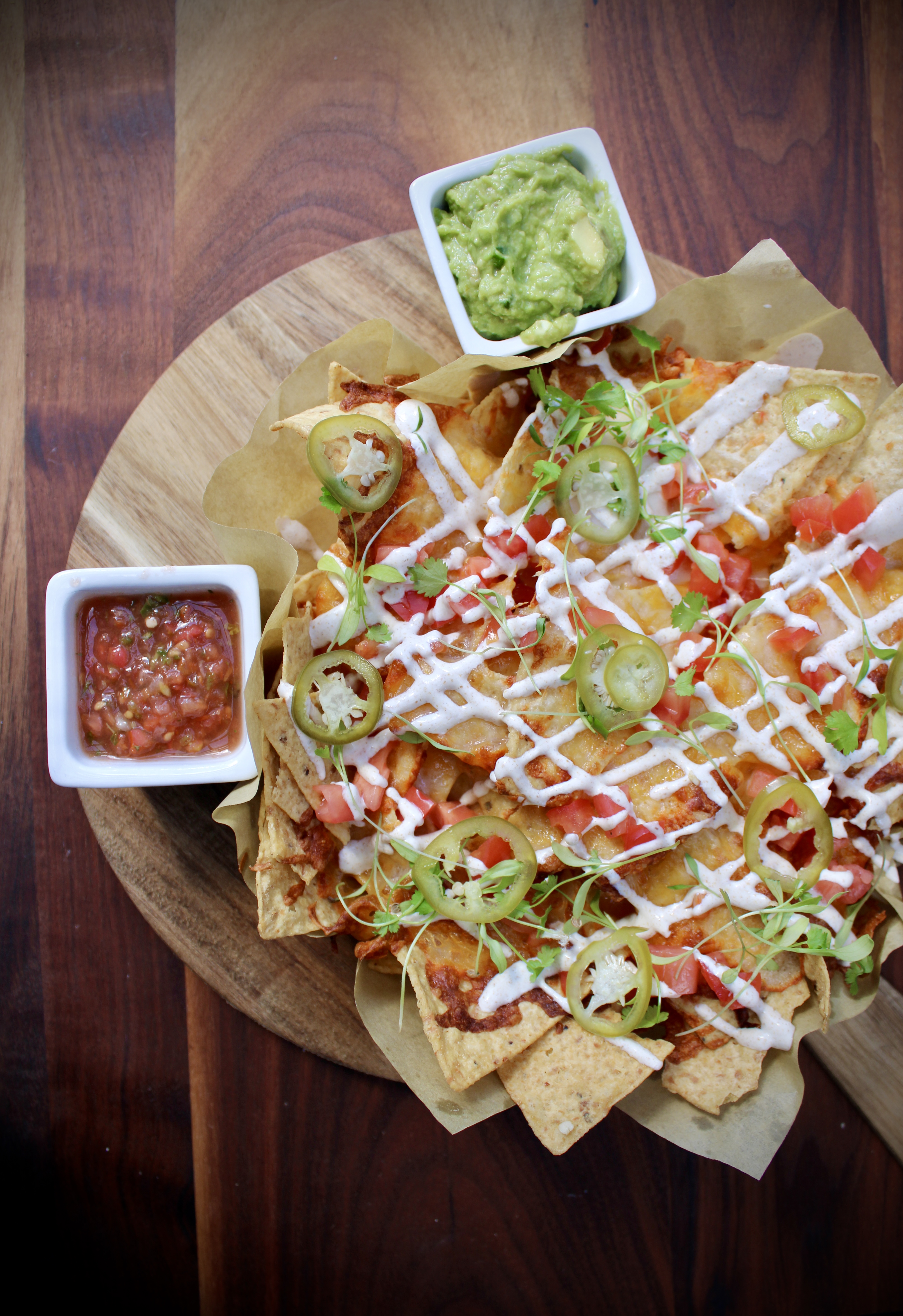 Tortilla chips with a double layer of cheese, tomatoes, coriander-lime crema, & microgreens, with sides of salsa, guacamole, & jalapenos