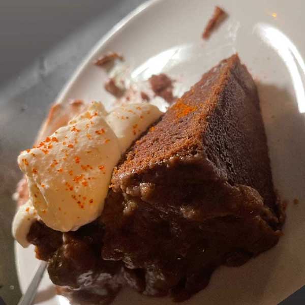 Chocolate sheet cake with chocolate pecan frosting, house-made whippie, and a hint of spice.